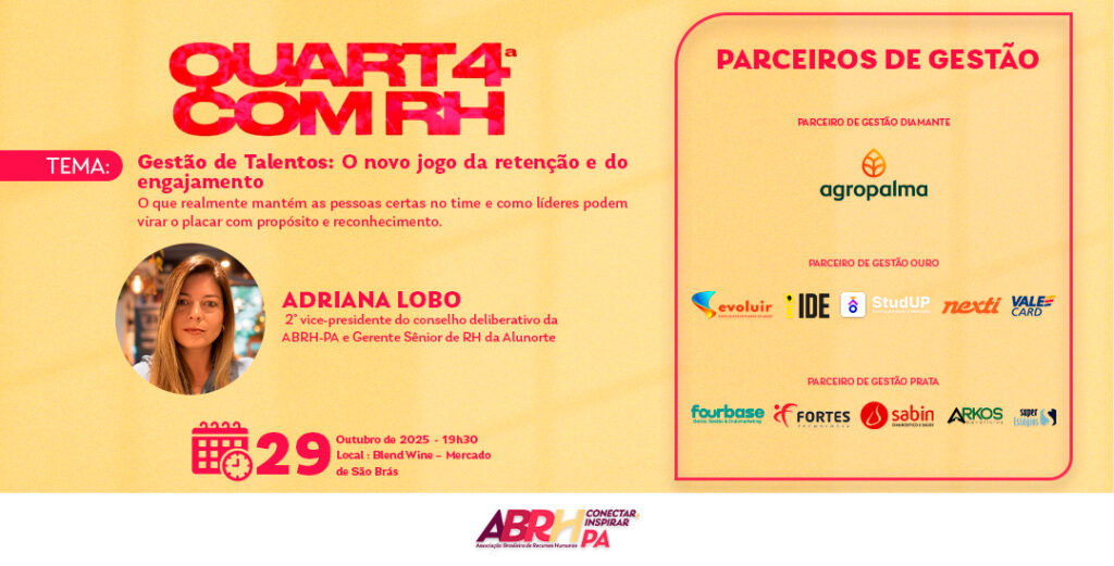 Quem conduz essa conversa é Adriana Lobo, 2ª vice-presidente do Conselho Deliberativo da ABRH-PA e Gerente Sênior de RH da Alunorte — profissional com mais de 26 anos de experiência em grandes empresas, especialista em liderança, desenvolvimento de times e cultura organizacional.